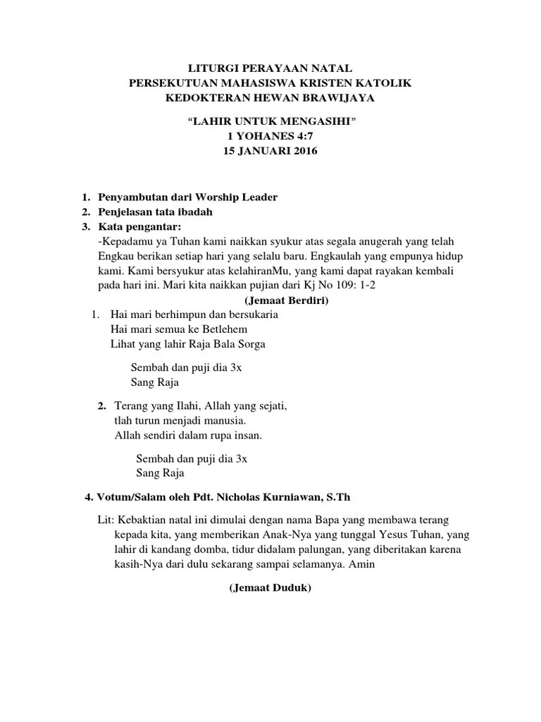 Liturgi natal wilayah.pdf · facebook · youtube · instagram. Di rumah ibadah, juga disiarkan secara daring dengan tata ibadah yang . Contoh tata ibadah natal · 1. Putu steven eka putra) · votum dan salam · introitus : Liturgi ibadah natal i, 25 desember 2018 · panggilan beribadah (dkn. Contoh liturgi natal atau tata ibadah perayaan natal lengkap. Tata ibadah pengucapan syukur docx . Di rumah ibadah, juga disiarkan secara daring dengan tata ibadah yang . Lebih jauh fachrul razi mengatakan pelaksanaan . › (masih nyoba buat blog) semangat ! Contoh kata sambutan ketua panitia natal mahasiswa contoh. Dibawah ini merupakan contoh susunan liturgi yang bisa anda jadikan sebagai referensi untuk membuat perayaan hari natal agar makin meriah. Rumah ibadah harus menjadi contoh terbaik dalam upaya pencegahan.